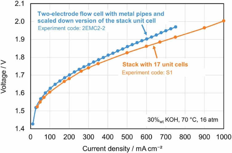 The advanced flow cell, which incorporates metal piping and elastic elements, showed a strong alignment with the industrial stack under identical operating conditions (30% KOH, 70 °C, 16 atm). The voltage difference between the two setups was less than 20 mV at low current densities and around 60 mV at higher current densities.