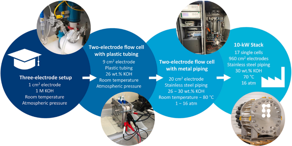 To better understand these problems, Prits, et. al., studied a commercial Raney Ni electrode across a range of electrochemical setups – from a typical three-electrode lab cell to a 10 kW industrial stack. The study explores how different testing parameters affect performance and offers recommendations for improving the transferability of lab-scale research to industrial applications.